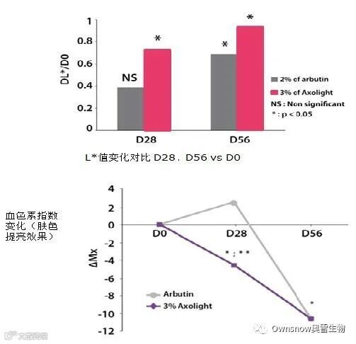 ▶ Axolight在28天内有显著亮肤功效,比熊果苷起效更快。