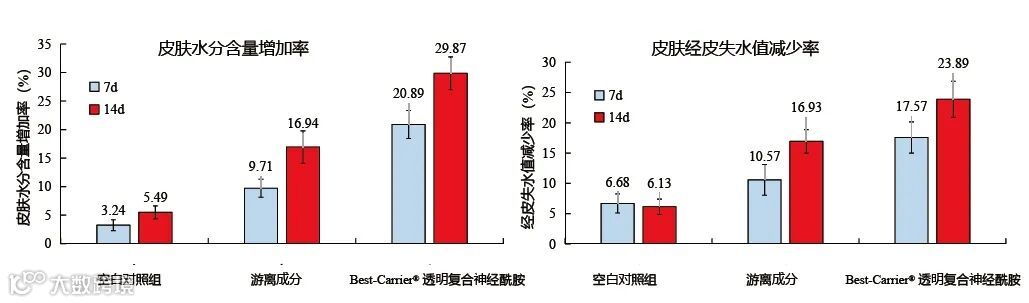 志愿者使用3%Best-Canrier® 透明复合神经酰胺7天和14天后,皮肤含水量显著提高、经皮水分流失量显著减少。
