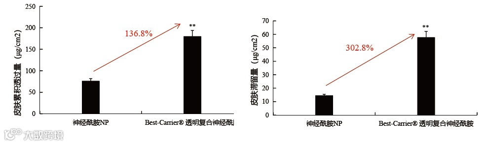经载体包裹后,神经酰胺的皮肤滞留量可提高3倍,累积透过量可提高近1.5倍