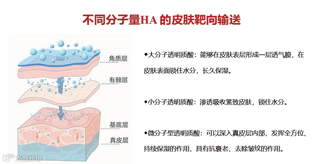 小分子HA(7-8KDa与3.9WDa):能够迅速渗透至真皮层,长时间滞留,从肌底修护受损细胞,清除自由基,抑制炎症因子。