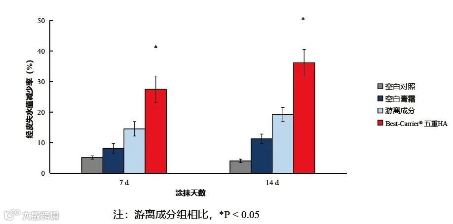 使用14d天后,涂抹Best-Carrier® 五重HA的TEWL值减少了36.17%,相对于空白对照,锁水力提高7.88倍,说明涂抹Best-Carrier® 五重HA后皮肤屏障修复迅速,经皮失水量显著减少。