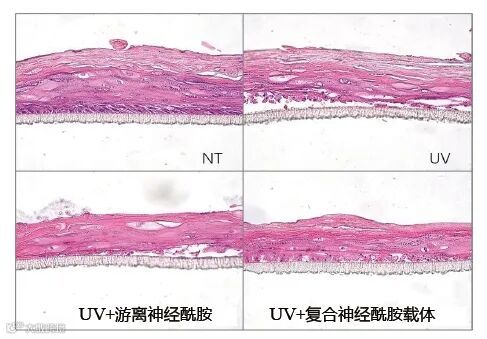 与UV组相比,游离神经酰胺和复合神经酰胺载体对UVB辐照处理造成的损伤有一定保护作用,游离神经酰胺处理过的表皮胞间连接较UV组有改善,复合神经酰胺载体处理过的表皮胞间连接和角质层较UV组均有改善。