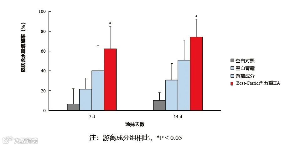 Best-Carrier® 五重HA能提升干燥肌肤水含量,效果优于游离HA;14 d后肌肤水含量增加率达到74.28%以上,相对于空白对照,补水力可提高6.4倍。说明Best-Carrier®五重HA具有长效保湿效果。