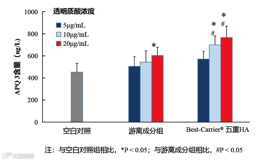 HaCaT细胞经游离活性成分和Best-Carrier® 五重HA处理24h后,APQ3含量均明显增加,且与游离成分组比较, Best-Carrier® 五重HA处理后APQ3含量增加明显(P<0.05)。