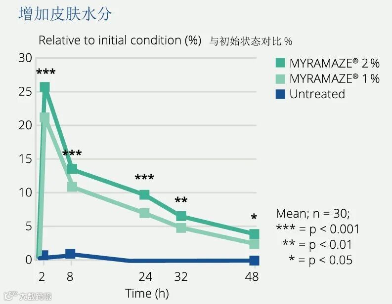 MYRAMAZE®单次使用可显著增加皮肤含水量25%,2 天后皮肤水分仍有显著改善▼