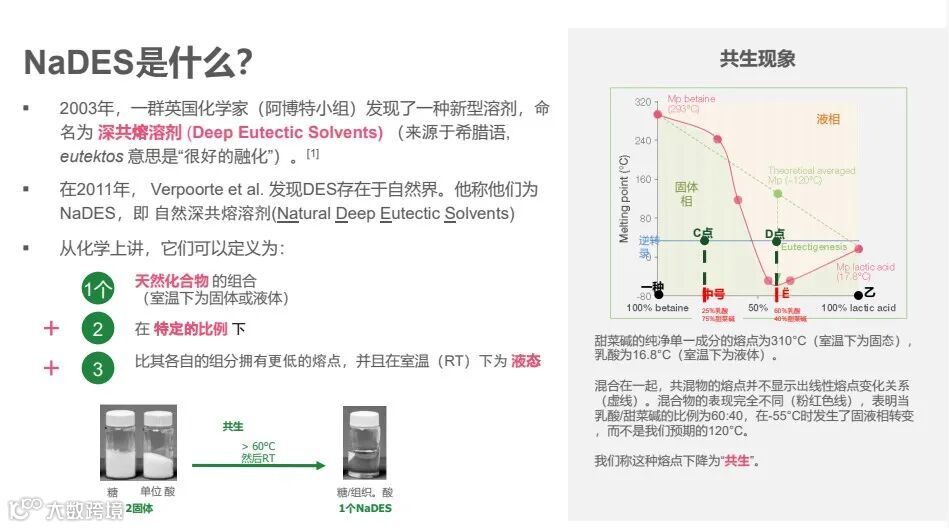 NaDES =多种天然化合物(室温下为固体或液体)的组合,其共熔点低于各个组分的熔点,在室温下表现为液体混合物。由于它们的特殊极性,NaDES构成植物中的第三种液相形式,能够溶解既不溶于水也不溶于脂的植物化合物。这一形态可以确保植物的存活(通过溶解水溶性差的重要代谢物来防止干旱,寒冷)。
