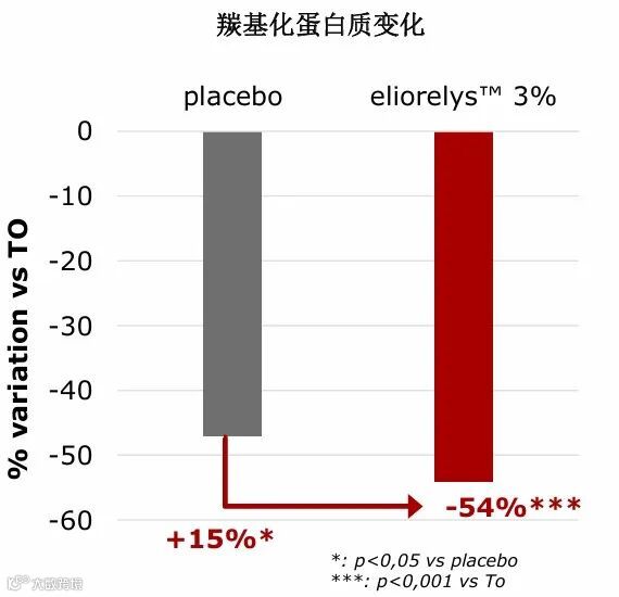 与安慰剂相比,Eliorelys™显著降低光老化皮肤的氧化(羰基化)蛋白质含量达15%。