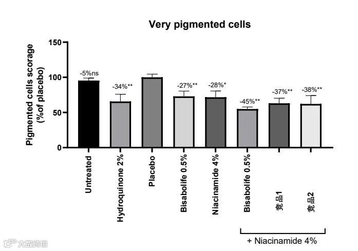 ▶ 0.5% Bisabolife和4% Niacinamide 的混合物显示出更强的美白效果。