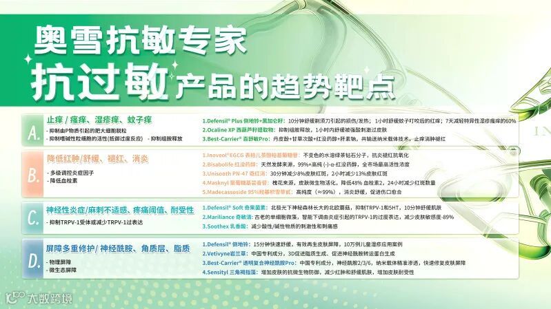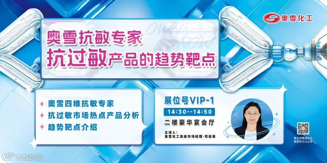 在本次会议中,奥雪化工将切入了火爆的“敏感肌”赛道,从精准护肤的维度带来了前沿的抗敏靶点科研成果,并发表主题演讲《抗敏专家——抗过敏产品的趋势靶点》,将最前沿的科研进展,结合海量数据进行调研剖析,把最直接的结果反馈给到现场的参会观众。