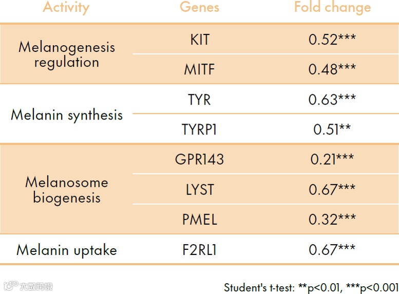 Illuminyl™388是一种强大的亮白分子,下调了参与色素沉着过程4个主要阶段的一整套基因的表达:黑色素生成、酪氨酸酶活性、黑素体成熟和黑色素转移▼