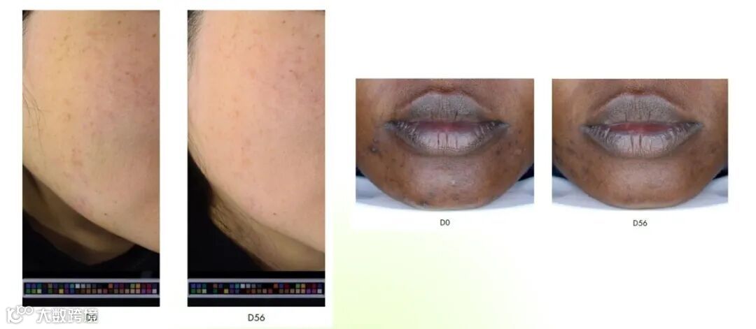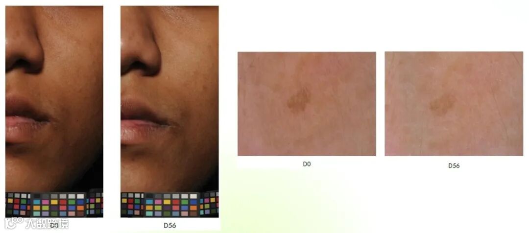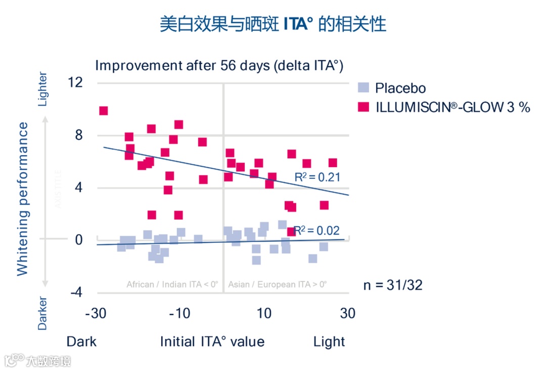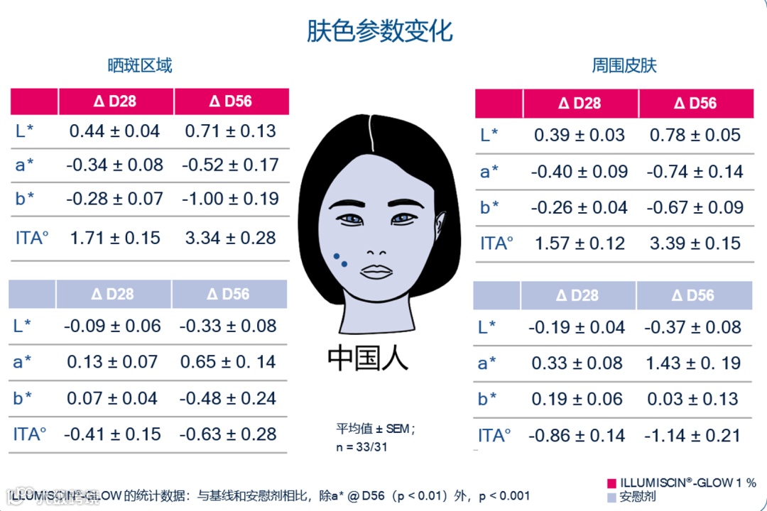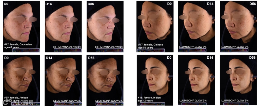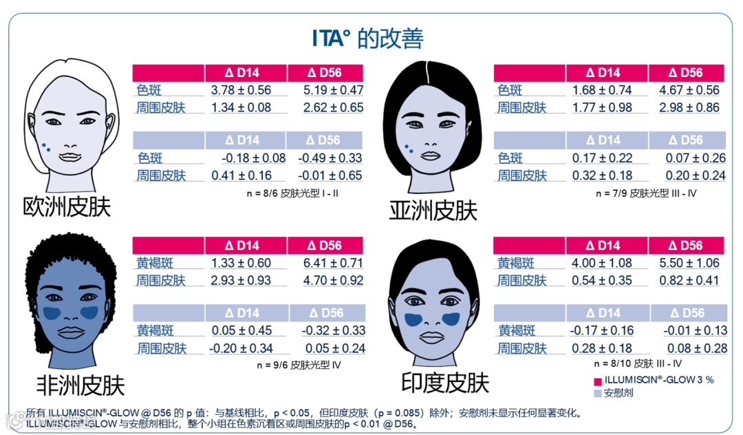②所有组别(多种族皮肤类型)晒斑/黄褐斑及周围区域的 ITA° 值均有所改善,皮肤变得更白。