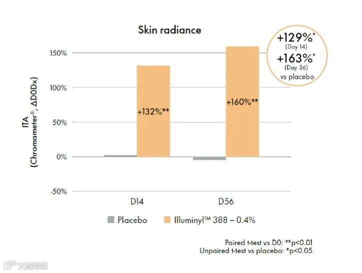 与安慰剂相比,Illuminyl™388在短短2周内显著改善皮肤光泽,高达+129%,并在2个月后进一步改善,高达+163%(印度皮肤类型)