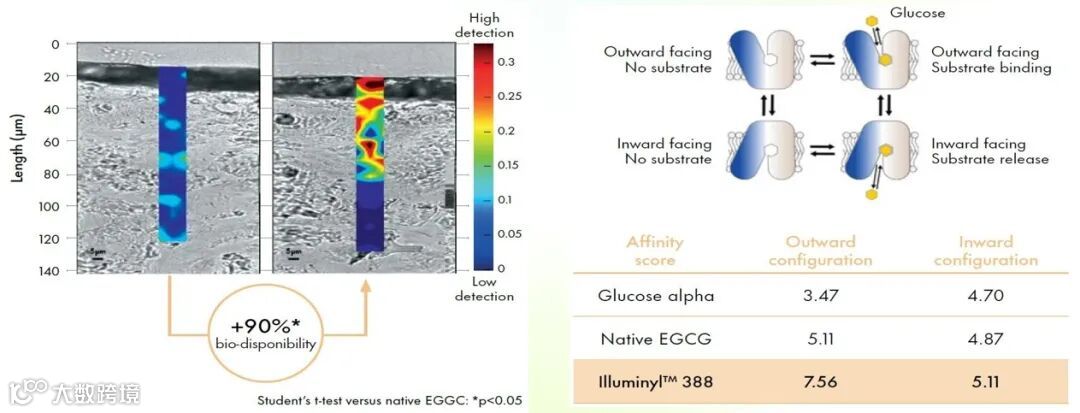 作为第三代EGCG,相比未糖苷化EGCG,Illuminyl 388具有卓越渗透性能,生物利用率+90%▼