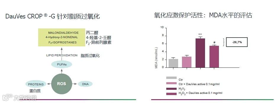 ▶ MDA水平反映了氧化应激通过膜脂过氧化造成的损伤程度。结果显示,DauVesCROP®-G预处理对H2O2引起的脂质过氧化具有保护作用(降低MDA水平),使其达到控制水平。