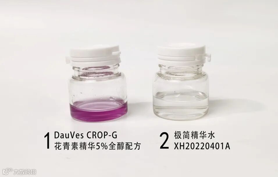 DauVes CROP®-G花青素精华5%全醇配方,与极简基础精华水混合搭配(1:2),双剂混合均匀,即成肤感清爽的具有多重功效的精华水。