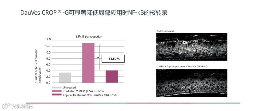 ▶ 当局部应用时,经PCR分析检测,DauVes CROP®-G可显著减少受照皮肤中NF-KB的核转录,从而抑制炎症产生的通路。