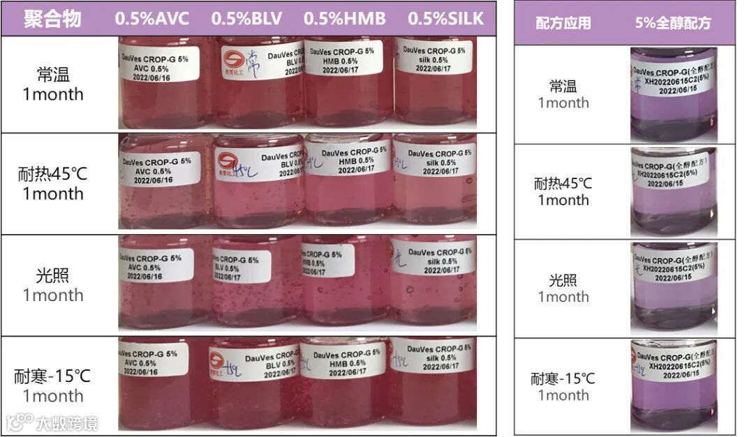 我们测试了多个因素:聚合物,pH,剂型,离子,抗氧化剂对花青素的影响,得到了两组珍贵的数据,如下图所示。我们发现:花青素在以下聚合物水溶液中或者在全醇体系中,稳定性远超应用在一个具有完整配方架构的体系中。