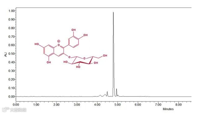 其中含有“非常稳定的原型”——520 nm处的UPLC峰值检测到的花青素-3-O-葡萄糖苷, 这些花青素在光照和温度下特别稳定。