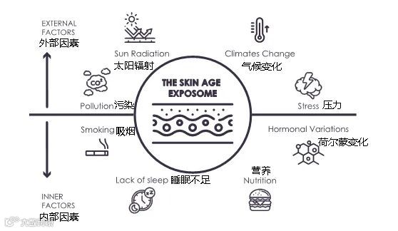 皮肤暴露组是指导致皮肤老化的广泛外部和内部暴露,包括太阳辐射、空气污染、烟草烟雾、营养不均衡和化妆品。