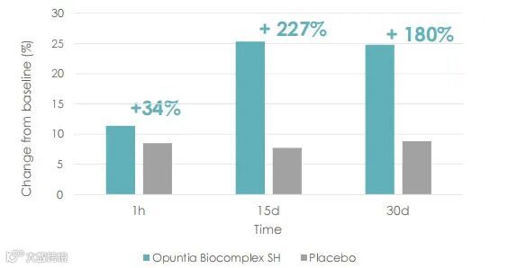 ▶肌肤的保湿能力显著提升:皮肤水分含量1小时后增加34%,15天后增加227%,30天后增加180%!