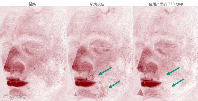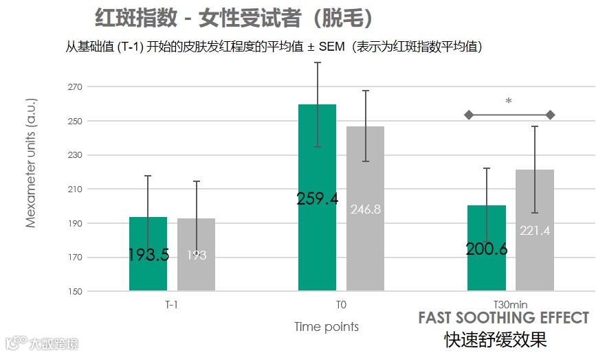 ▶ 含有 1.5% 皮肤保护成分的活性配方可在使用后 30分钟显着减少脱毛引起的皮肤红斑,使数值恢复到接近基线水平。