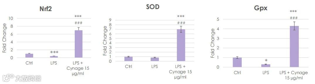 ▶用CYNAGE™预处理能够增加参与抗氧化防御的基因的mRNA 表达水平(Nrf2、SOD、Gpx 的 mRNA 表达水平)