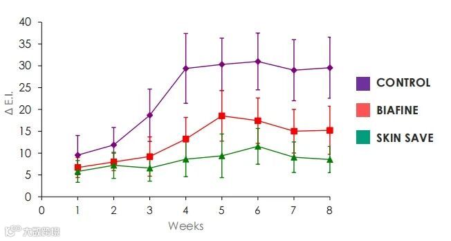 舒缓效果的临床评估:活性成分 Skin SaveTM对经太阳能模拟器 (UVA+UVB) 照射的皮肤。