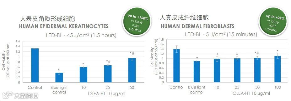 测试结果:用OLEA-HT 10 预处理角质形成细胞和成纤维细胞可增加细胞活力,显示出对LED-BL 诱导的损伤的保护作用。