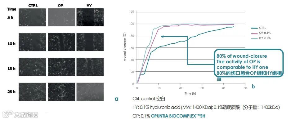 体外细胞培养的伤口愈合研究(时间延迟实验):在40小时监测期间通过延迟实验获得的HaCat细胞伤口闭合图像(a)和伤口闭合百分比的变化(b)