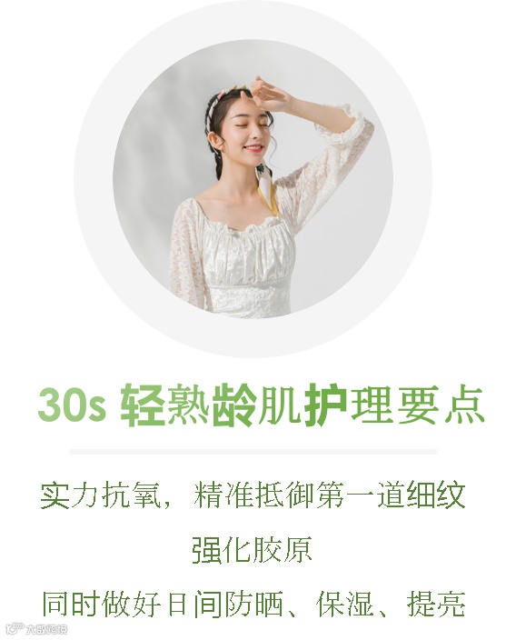 对于30+的女性,在UV、环境污染、熬夜等影响之下,肌肤面临较大的氧化压力,容易暗沉、缺乏弹性、略显松弛,皱纹问题还不明显。因此30+年龄段的抗衰,关键是抗氧化强化真皮胶原,抵御细纹、预防垮脸,守住彭弹紧致、细腻有光的肌肤状态。