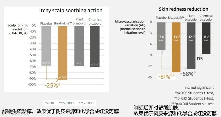 天然可持续发酵来源(-)-α-红没药醇,纯度高达99%以上,金合欢醇含量≤ 0.05%。