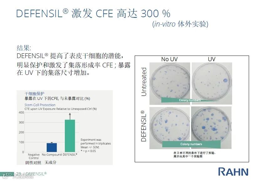 DEFENSIL (in-vitro 体外实验)被验证,具有保护在UV照射下表皮干细胞的活力,激活CFE高达300%。