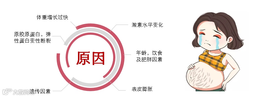 妊娠纹是属于妈妈们的新生印记。造成妊娠纹的原因有很多,其中真皮层弹性纤维的断裂是非常关键的因素。