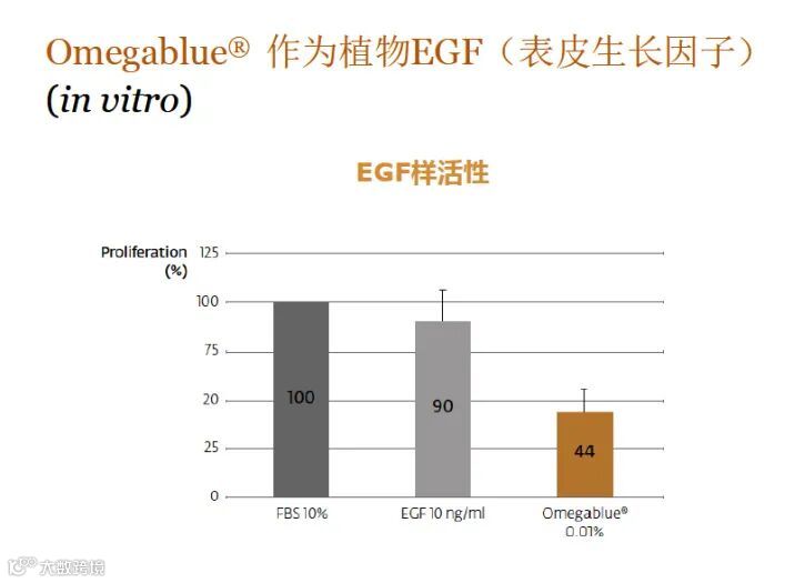 ▶ Omegablue®具有刺激细胞增殖(如EGF)的能力,众所周知,EGF可刺激细胞生长和分化,从而改善皮肤屏障功能。