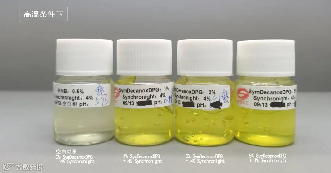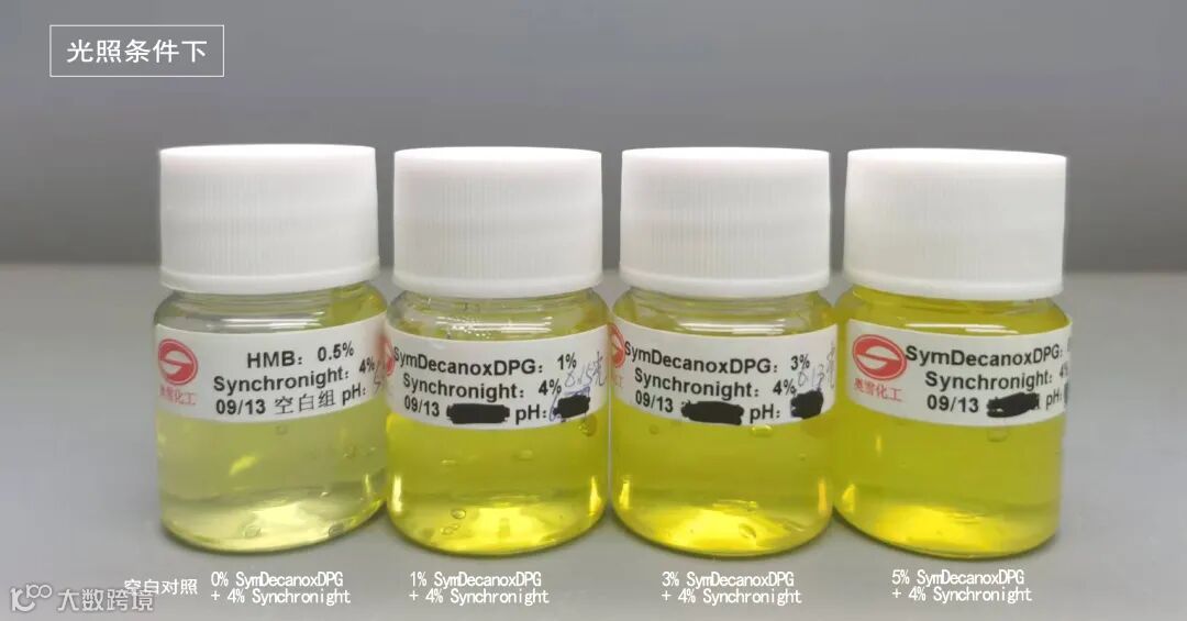在日光照射、加热(45°C)两种条件下,对照组褪色明显。而添加1%、3%、5%的SymDecanox豆蔻籽酮+Synchronight,3个月后配方颜色仍然保持稳定不褪色。