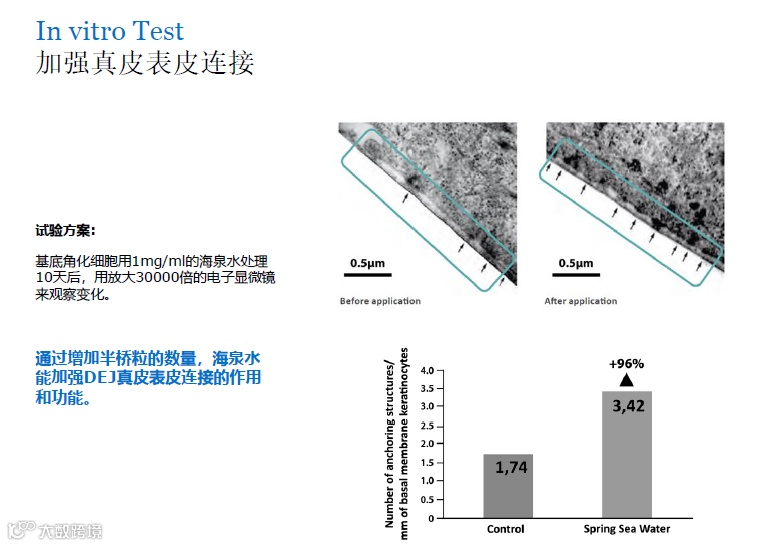 海泉水通过增加半桥粒的数量,加强DEJ真皮表皮连接的作用和功能。