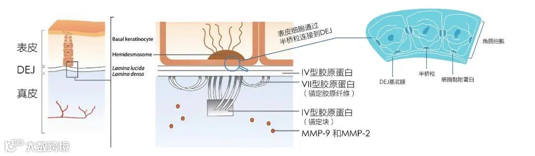 DEJ主要由胶原蛋白IV和锚定结构组成,而锚定结构又包括半桥粒和锚定原纤维(由胶原蛋白VII组成)。