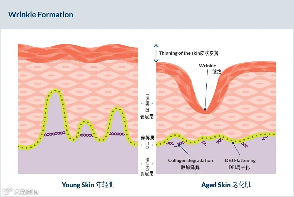 DEJ是连接真皮与表皮的机械支撑,DEJ的扁平化抑制了真皮层-表皮层的信号交流和营养交换,表皮失去弹性和紧致度,皮肤更容易松垮,进而产生皱纹。