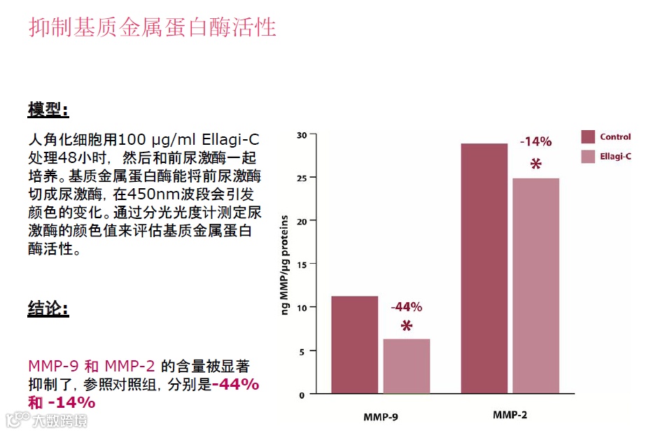 ▶ 抑制MMPs活性-保护DEJ完整性: Ellagi-C能抑制MMP-2和MMP-9活性,减少DEJ中IV胶原蛋白降解
