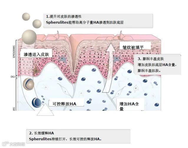 · Spherulites 渗透至皮肤的底层,然后在目标区域持续释放透明质酸,发挥长效作用功能▼
