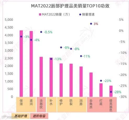 ▶ 来自美业研究院的数据显示,2022年唇部护理品类销量排行中,淡化唇纹成为继保湿、滋润之后,排在Top3的品类需求。