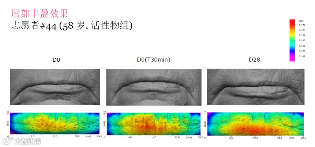 使用高分辨率三维摄影技术 (VECTRA) 测量丰唇效果。在唇部涂抹化妆品配方,每天两次。在涂抹之前 和涂抹之后的第 7 天和第 28 天进行测量。