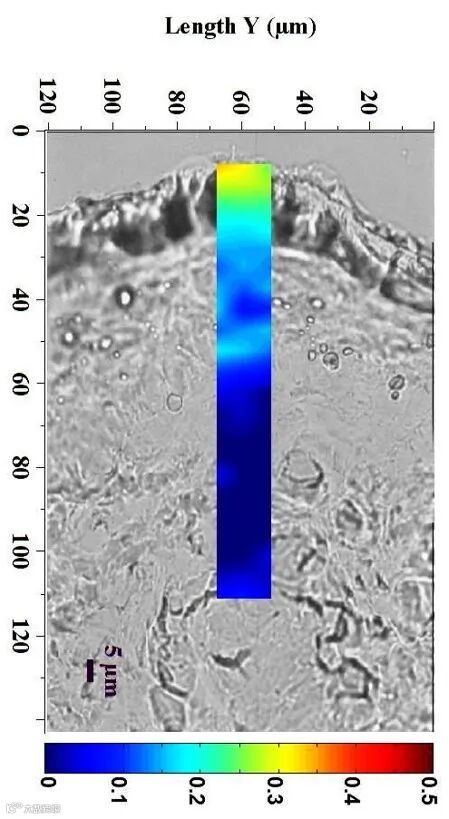 Spherulite™HA Ultimate 特定标记的存在通过拉曼显微成像测量,并通过“拟合”在 0 和 120 μm 之间的区域(皮肤表面下方)进行分析。