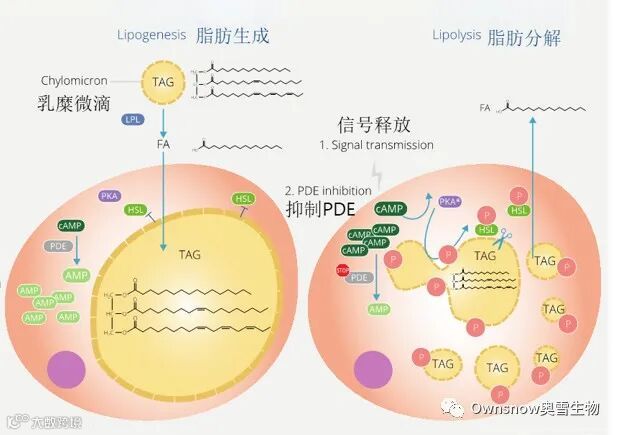 脂肪生成过程:脂肪细胞内积累游离脂肪酸,通过酯化反应生成甘油三酯,储存在脂肪囊泡内,充涨脂肪细胞。脂肪生成是通过 cAMP浓度控制的(环磷酸腺苷,关键的细胞信号因子),低浓度时促进脂肪合成,高浓度时促进脂肪代谢。参与甘油三酯合成的关键酶是LPL(脂蛋白脂肪酶)、PDE(磷酸二酯酶)。