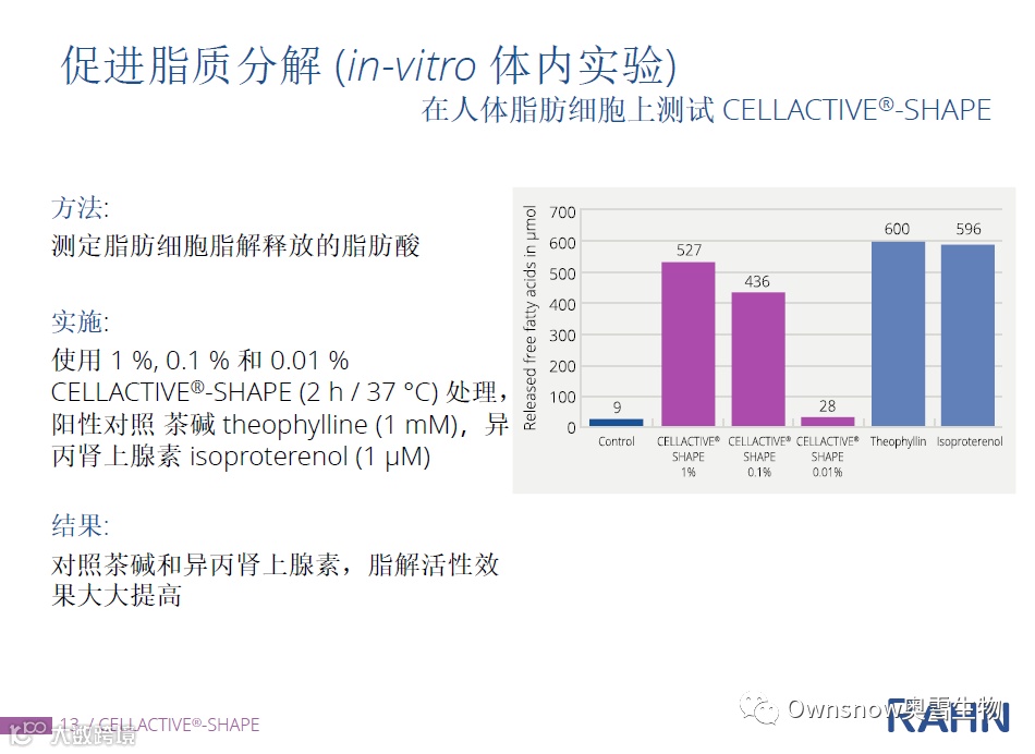 • 促进脂肪分解,对照茶碱和异丙肾上腺素,脂解活性效果大大提高。(in-vitro 体外实验)