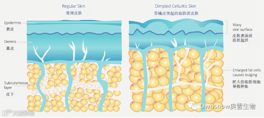 弹性结缔组织和脂肪存储导致了脂肪团的形成。橘皮组织的结构特点:①肥大脂肪细胞导致肿胀;②皮肤表面波浪状起伏。