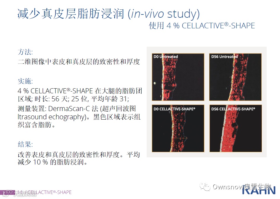•改善表皮和真皮层的致密性和厚度,减少真皮层脂肪浸润 -10%。(in-vivo 体内实验)