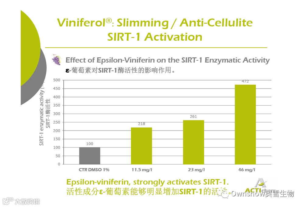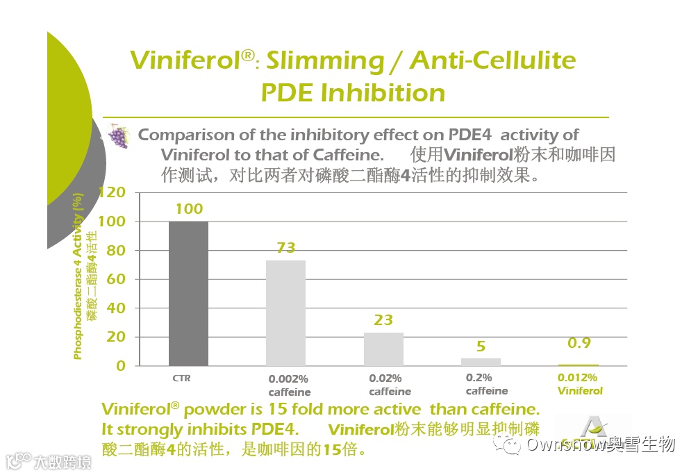 VINIFEROL功效经过验证:磷酸二酯酶的活性通过与咖啡因的对比,是咖啡因的15倍;激活组蛋白去乙酰化酶(SIRT-1)的活性,增加脂解作用,减少脂肪生成。