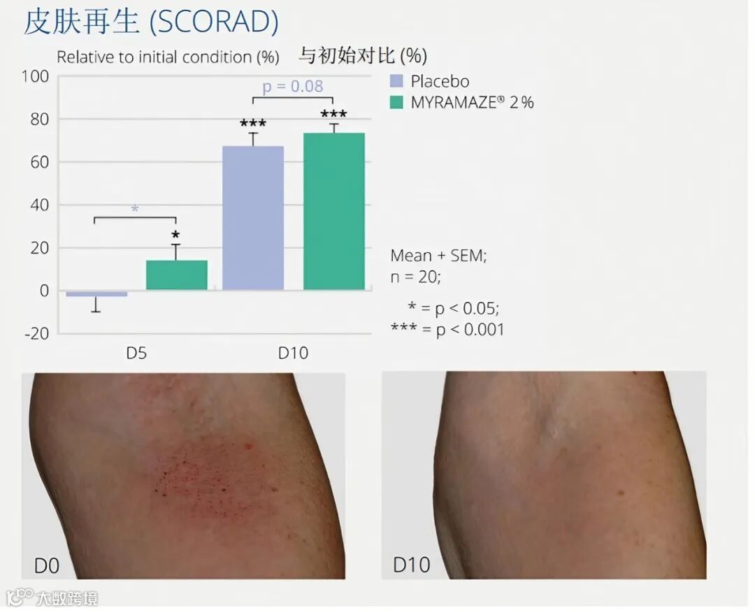 2%的MYRAMAZE® 能够再生并舒缓受压皮肤,当皮肤收到损伤,甚至产生创伤面时,可将此种情况类比为特应性皮肤的状态,所以在无组织液渗漏的情况下MYRAMAZE®也能起到修护的效果,在10天后能让受损面恢复到完美的状态,不留下疤痕和瘢痕▼