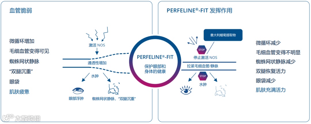 PERFELINE® -FIT减少眼部浮肿和腿部的蜘蛛网状血管扩张,舒缓肌肤压力和泛红,使您从头到脚都拥有清醒、健康和充满活力的外观。